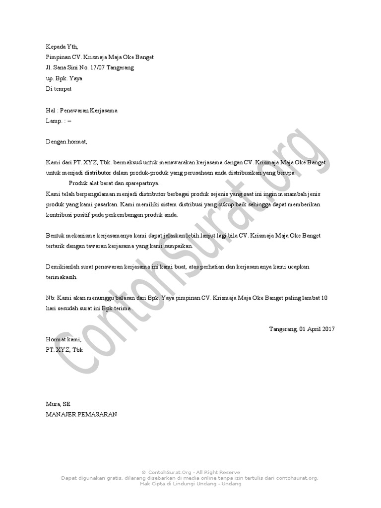 Selain itu, produk yang ditawarkan bisa menjadi salah satu produk yang dibeli oleh. Surat penawaran ini biasanya dipakai tidak hanya untuk aktifitas bisnis saja, tapi biasa surat penawaran harga bisa juga disebut sebagai alat pemasaran suatu produk atau jasa. Dari beberapa contoh surat penawaran jasa di bawah ini, dapat disimpulkan bahwa surat penawaran produk barang dan jasa sebenarnya tidak jauh berbeda. Contoh surat penawaran produk makanan juga bisa dilihat contoh penawaran jasa catering. Ternyata dalam membuat surat penawaran, susunan dan aturannya harus sesuai selingkung dan puebi lho!